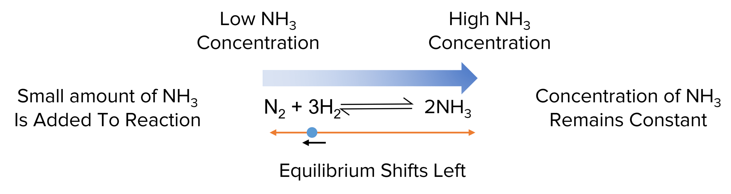 In the case of the reaction above, if small volumes of ammonia are added to the equilibrium, increasing is concentration, it will shift towards the left to get rid of the excess.