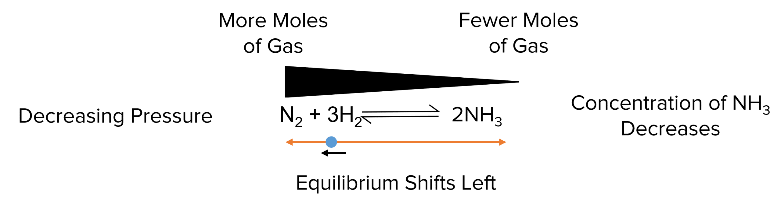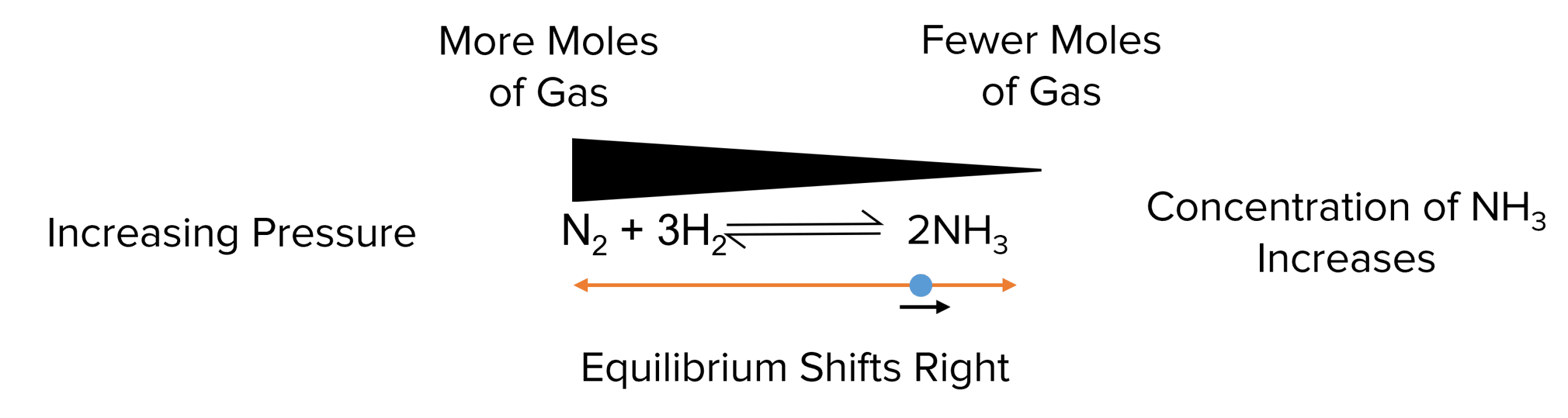 Again we can look at the reaction of hydrogen and nitrogen to form ammonia. In this reaction, four moles of gas react on the left hand side to produce two moles of gas on the right. In this case, when the pressure of the equilibrium is increased, the equilibrium will shift to the right to decrease the number of moles in the system. This increases the concentration of \text{NH}_3 and decreases the concentration of \text{H}_2 and \text{N}_2.