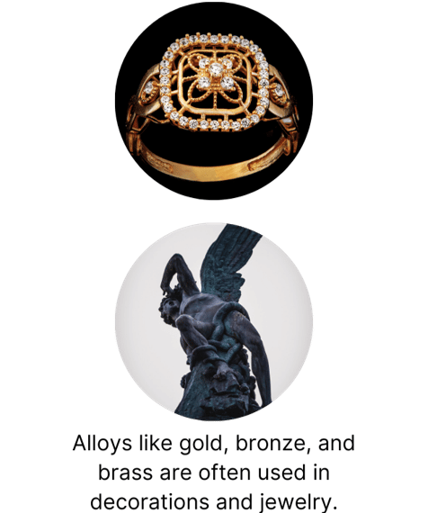 Alloys are also used frequently in jewellery and art. Gold is often alloyed with other metals like silver, copper, and zinc, increasing its hardness.