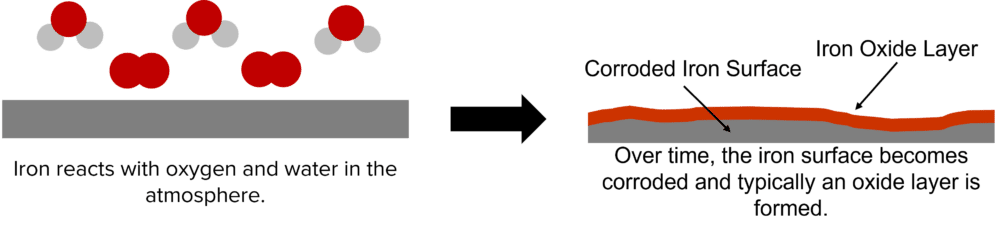 Corrosion is the process whereby metals are broken down by chemicals in the environment. Rusting is the well known form of corrosion and is the breaking down of iron by oxygen and water in the air. This process destroys the iron metal, forming a layer of iron oxide (rust) on the surface of the metal.