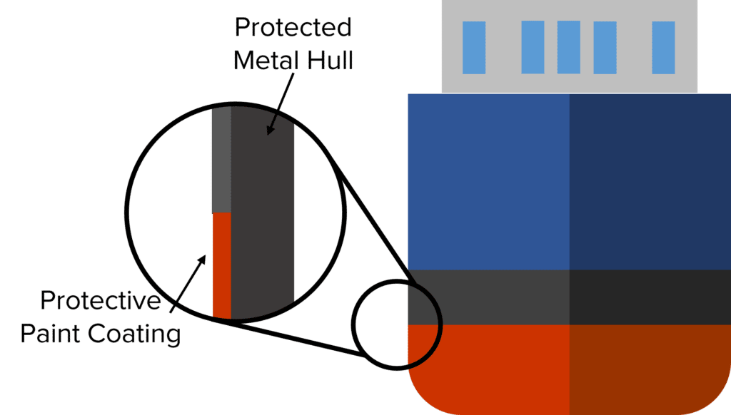 For example, the hulls of ships are at risk from corrosion by sea water. To prevent the metal hull from corroding, risking its structural integrity and allowing water to penetrate, ships are often painted to provide a protective barrier on the surface of the hull. This protective layer stops the sea water from reaching the surface of the metal preventing chemical reactions and stops the hull from being corroded.