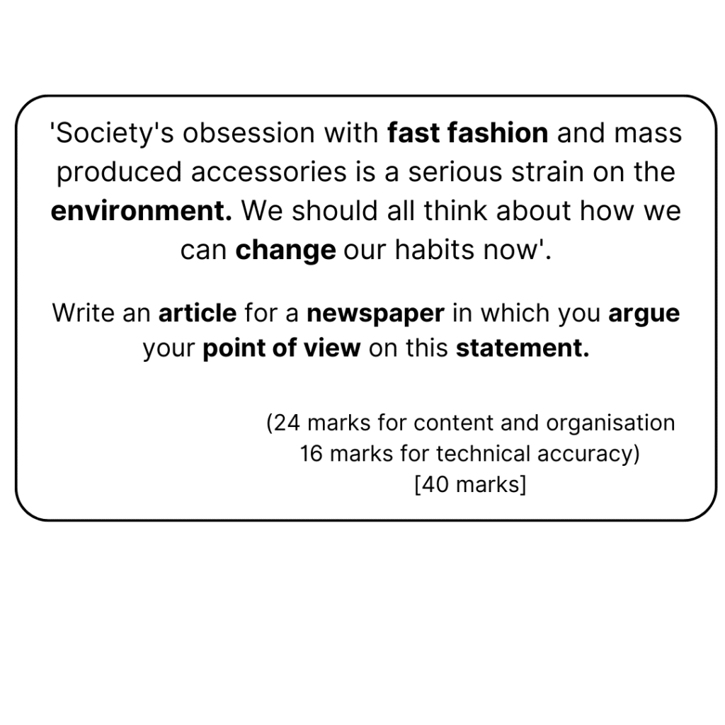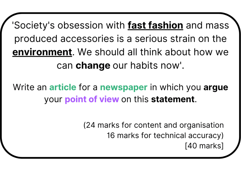 The question will specify a format for you to use, like a newspaper article or letter, so it’s important to be aware of the structural features associated with different types of text.