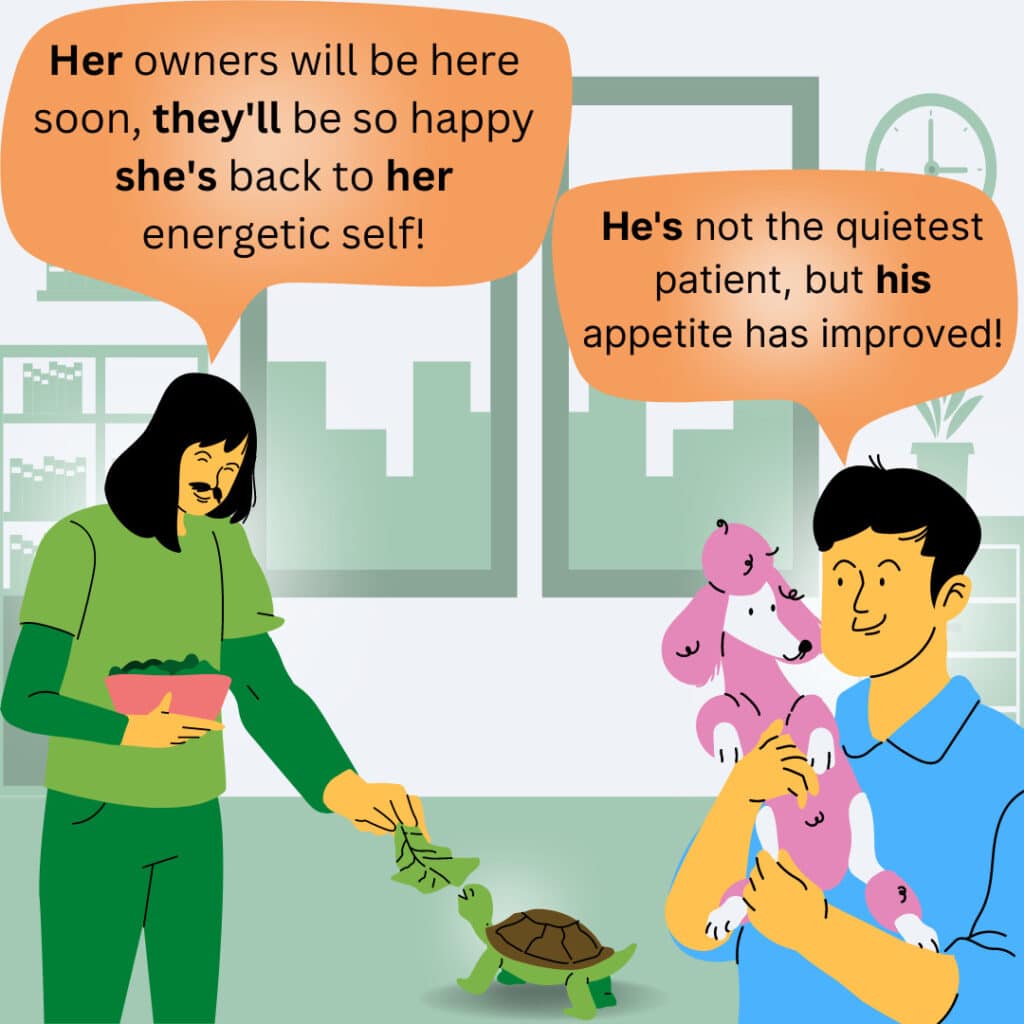 It’s easy to spot through pronouns like ‘she’, ‘they’, ‘he’, ‘hers’, ‘their’, ‘him’, ‘her’, ‘his’, ‘herself’, ‘it’, ‘it’s’, ‘itself’, ‘they’, ‘them’, ‘themselves’.