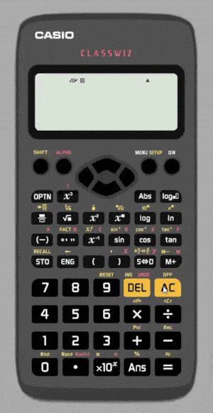 To cube root a number, we can use the \color{black}{\sqrt[3]{\square}} button. On our calculator, this can be accessed by activating the SHIFT key, then pressing the square root symbol (\color{black}{\sqrt{\square}}). Pressing the button allows you to type a number underneath the cube root symbol. Pressing \color{black}= will perform the ‘cube root’ operation on the number you type in.