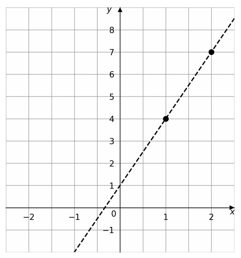 Any two points on the coordinate plane can be connected by a straight line. So we must be able to find an equation for this straight line. So lets find the equation to the line that passes through (1, 4) and (2, 7).