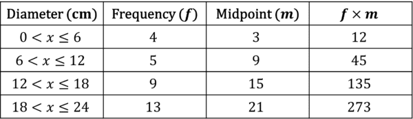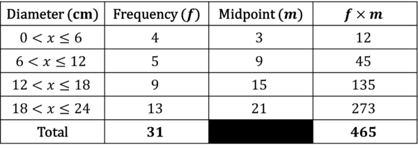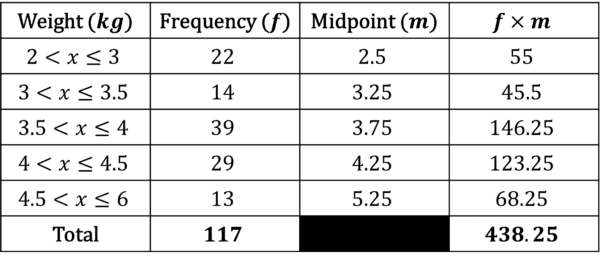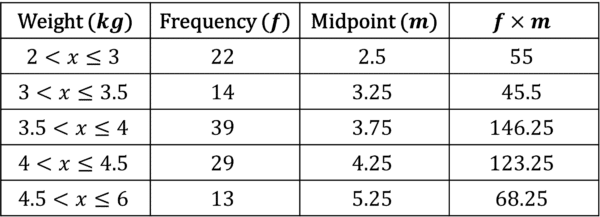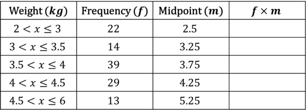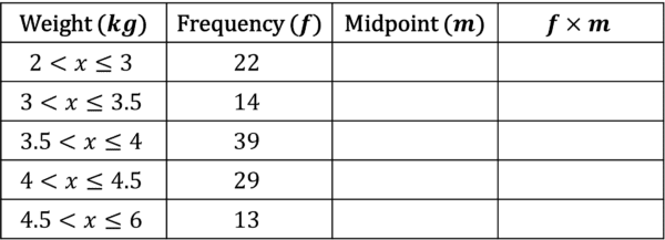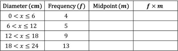Step 1: Add two new columns to the table, one called midpoint and one called midpoint \times frequency.