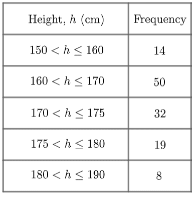 A < sign attached to a number means the class does not include that number. In the table above we can see that the class 150<h\leq160 does not include people who are exactly 150\text{ cm} tall.