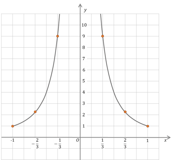 y=\dfrac{1}{(-1/3)^2} = \dfrac{3^2}{1}=9,
