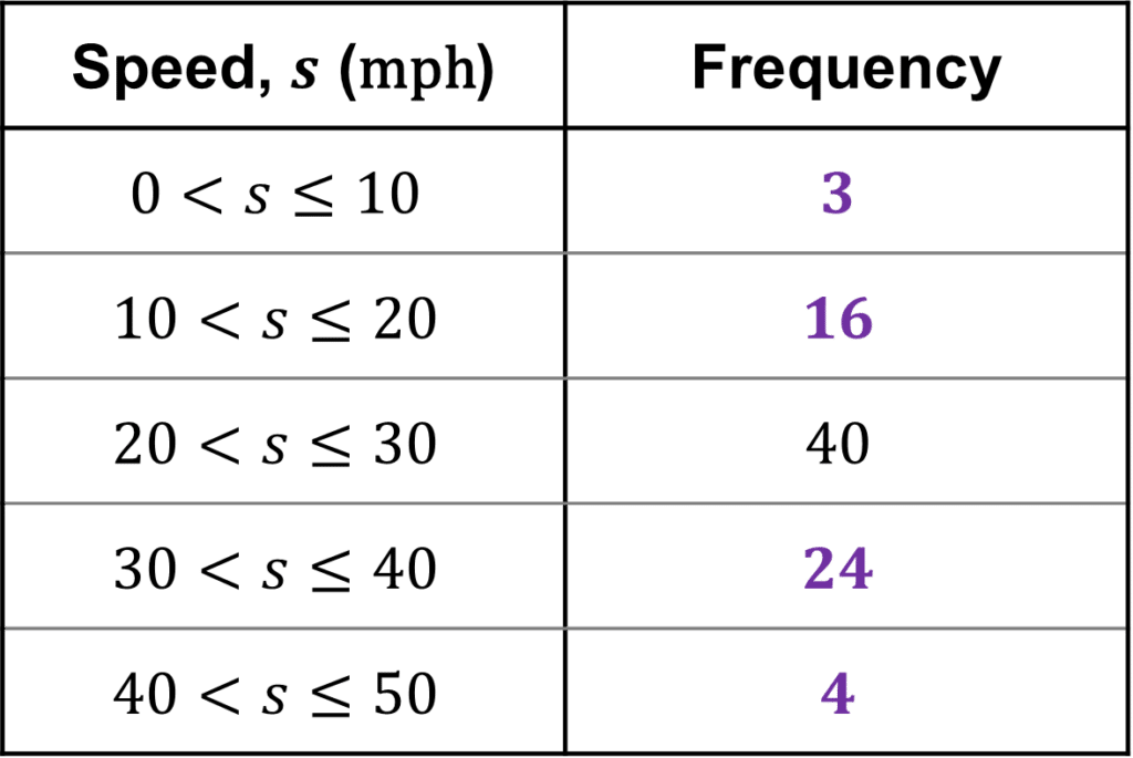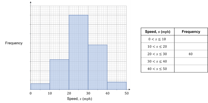 The histogram below, shows the speeds of different cars driving through a 30 \text{ mph} zone. Use the histogram to complete the grouped frequency table.