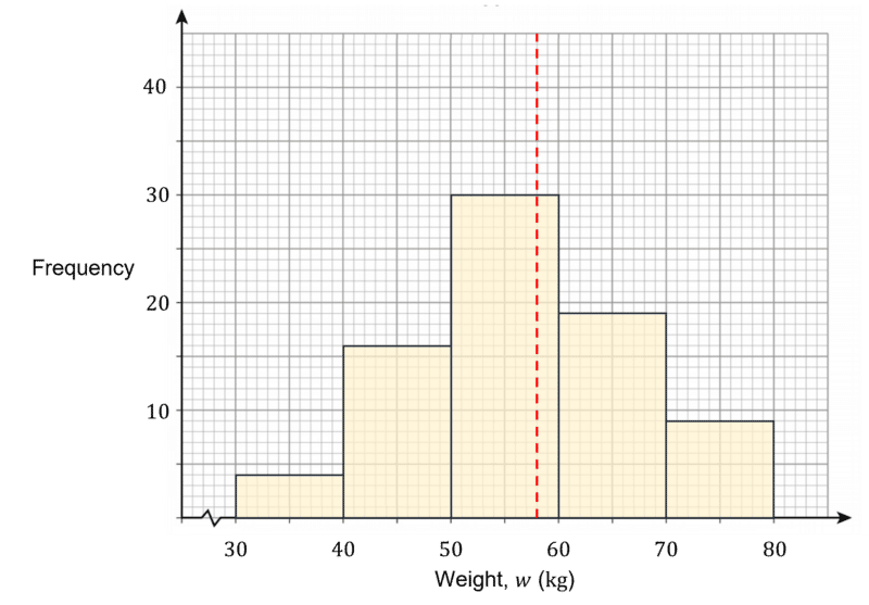 Using this line, we can see that \dfrac{2}{10} of the 50<w\leq 60 bar and all of the 60<w\leq 70 and 70<w\leq 80 bars are above 58 \text{ kg}.