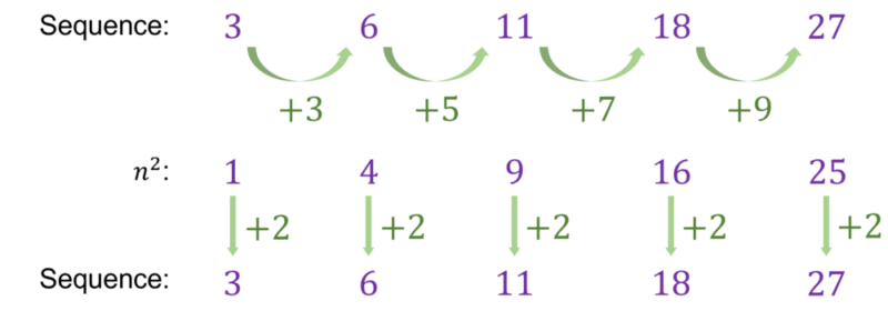 For harder quadratic sequences you will be required to work out the second difference (or differences between the differences) to work out the coefficient of the n^2 term in the nth term.