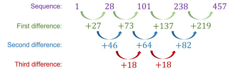 In this case we can see that the first differences are \textcolor{#10a6f3}{+27,+73,+137,+219}, the second differences are \textcolor{#10a6f3}{+46,+64,+82} and then the third difference is \textcolor{#10a6f3}{+18}.