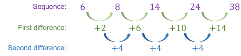 In this case we can see that the first differences are +2,+6,+10,+14 and then the second difference is \textcolor{#10a6f3}{+4}.