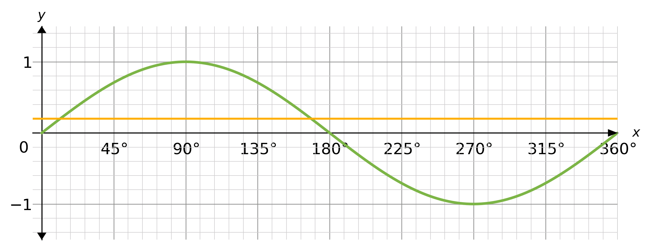 The yellow line crosses the sin graph at approximately x=11\degree and x=169\degree. These are the approximate solutions to the equation \sin(x)=0.2