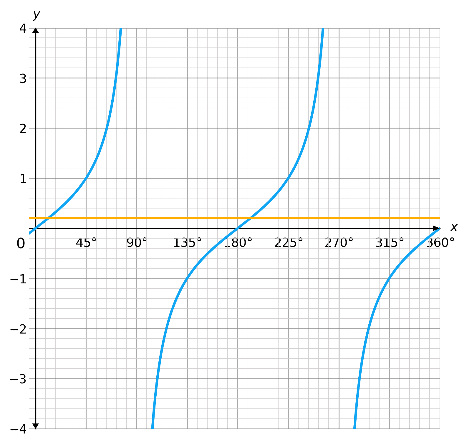 The yellow line crosses the tan graph at approximately x=11\degree and x=191\degree. These are the approximate solutions to the equation \tan(x)=0.2