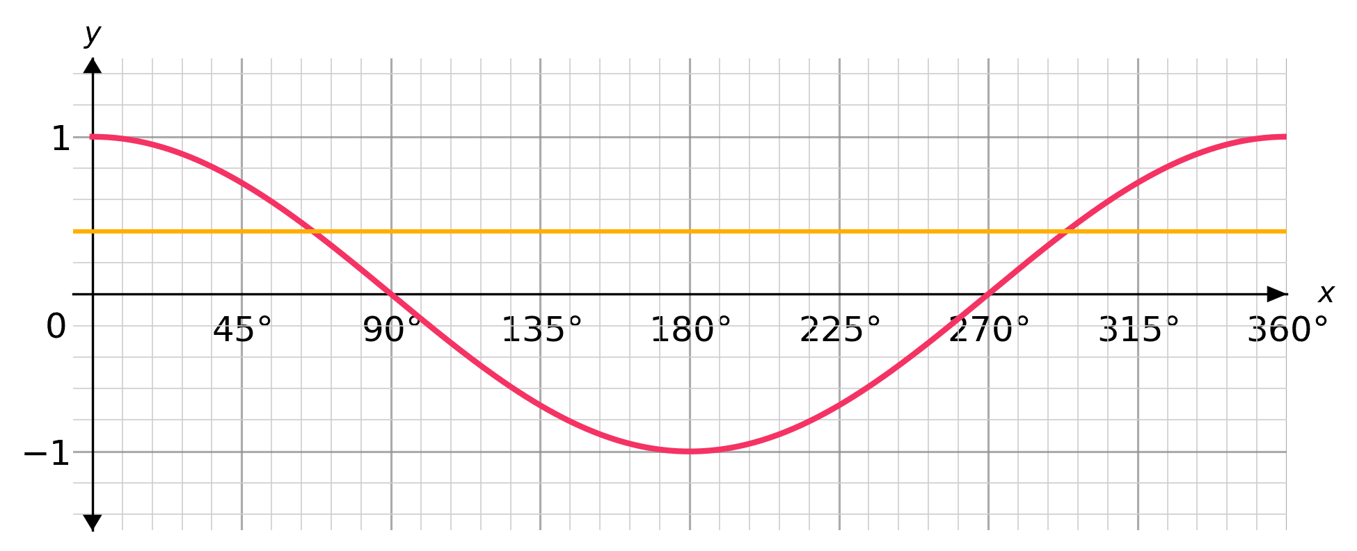 The yellow line crosses the cos graph at approximately x=78\degree and x=282\degree. These are the approximate solutions to the equation \cos(x)=0.2
