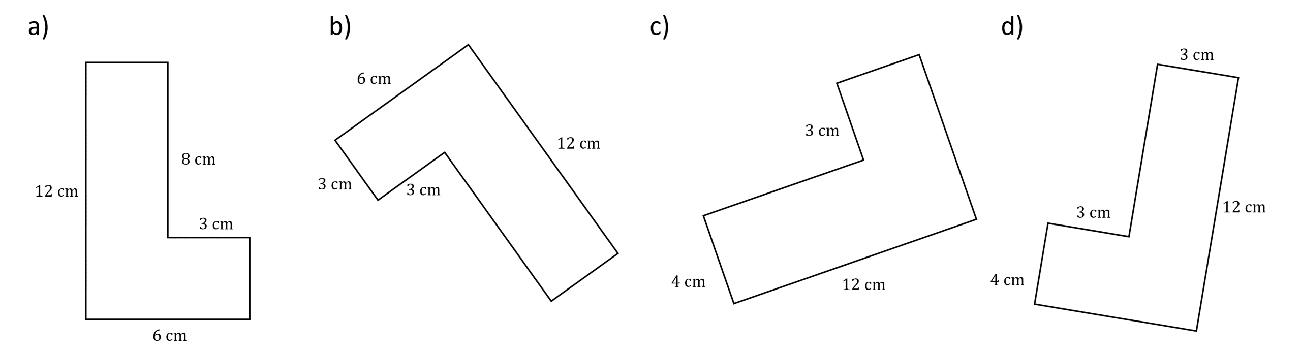 Top of L shape: for a), we can work out the top of the L is length 3\text{ cm}, which is the same as b) and d). We can ignore c) going forward as it definitely is not congruent.