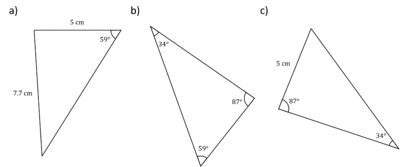 b) Could be congruent but we do not have enough information so cannot prove congruence by having three of the same angles.