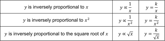 or y is inversely proportional to x, where k is the ‘constant of proportionality’.