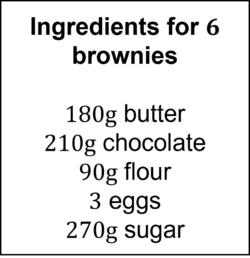 Sarah wants to make 10 brownies. Work out how what quantity of each ingredient Sarah will need.
