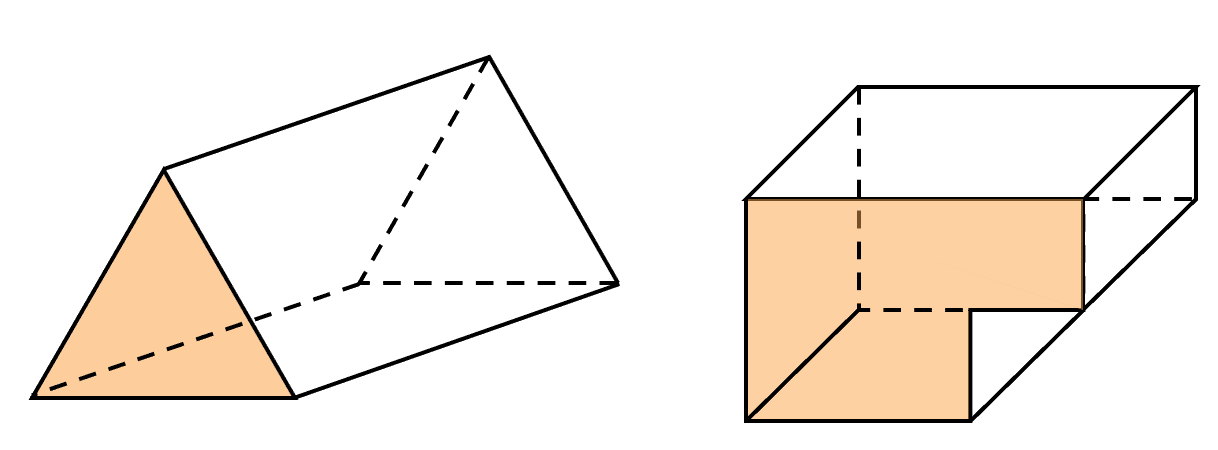 A prism is a 3D shape that has identical faces at both ends, i.e. the shape has a constant cross-section (shaded faces in the diagram below) in one particular direction. Take a look at the examples below: