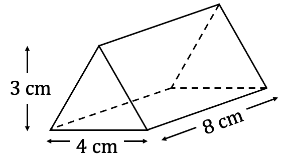 Surface area of triangular prism : 8\sqrt{13} + 8\sqrt{13} + 32 + 6 + 6 = 44 + 16\sqrt{13} or 101.69 \text{ cm}^2