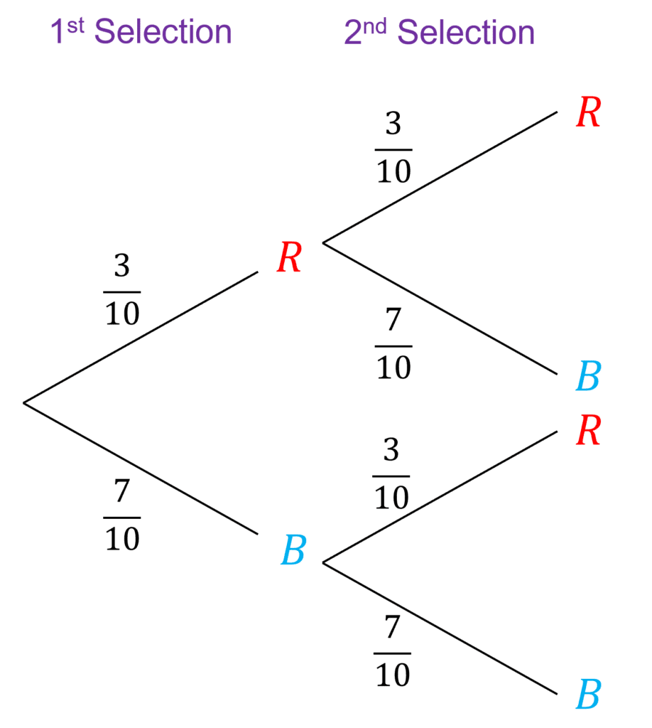 So, on the first selection on the diagram you can see that the probability of red is \dfrac{3}{10}