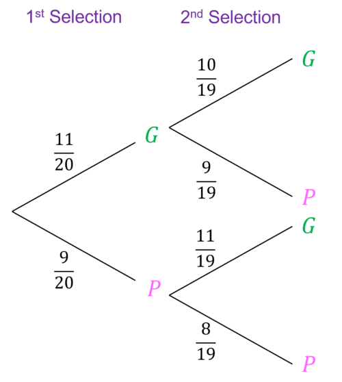 \text{P}(G\text{ and }G)=\dfrac{11}{20}\times\dfrac{10}{19}=\dfrac{11}{38}