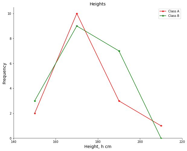 Class A: The greatest frequency lies in between 160 \text{ cm} and 180 \text{ cm}, so the mode lies in the 160\leq h<180 class