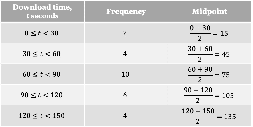 The table below shows an example of various classes, with their respective frequencies and midpoints.