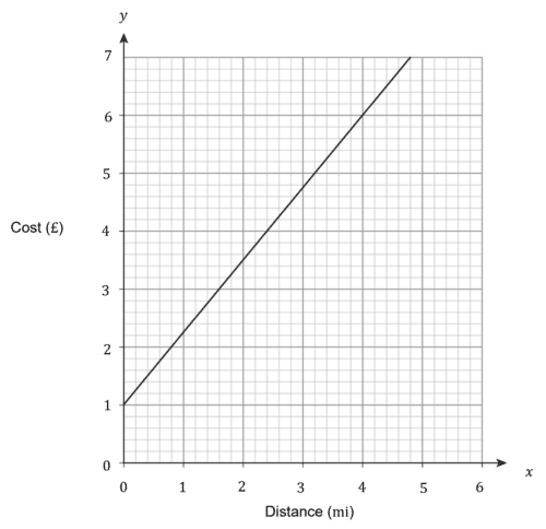 \text{Cost per mile}=\dfrac{7-1}{4.8-0}=\dfrac{6}{4.8}=£1.25