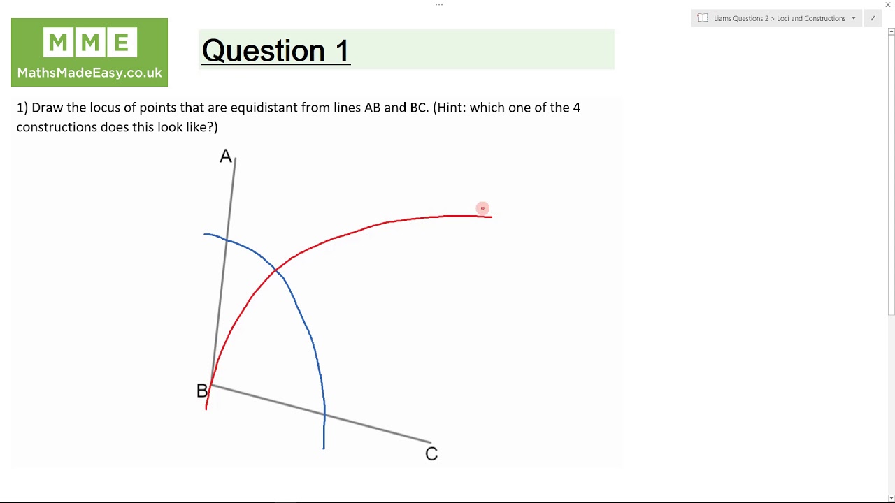 Question 1: Draw the locus of points that are equidistant from lines AB and BC. (Hint: which one of the 4 constructions does this look like?)