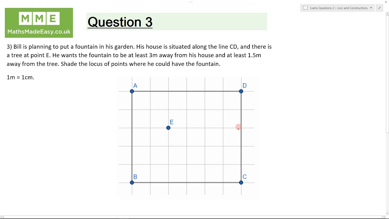 Then, the locus of points which are 1.5m away from the tree at E will be a circle of radius 1.5cm – for the fountain to be at least 1.5m away, it must be outside this circle.