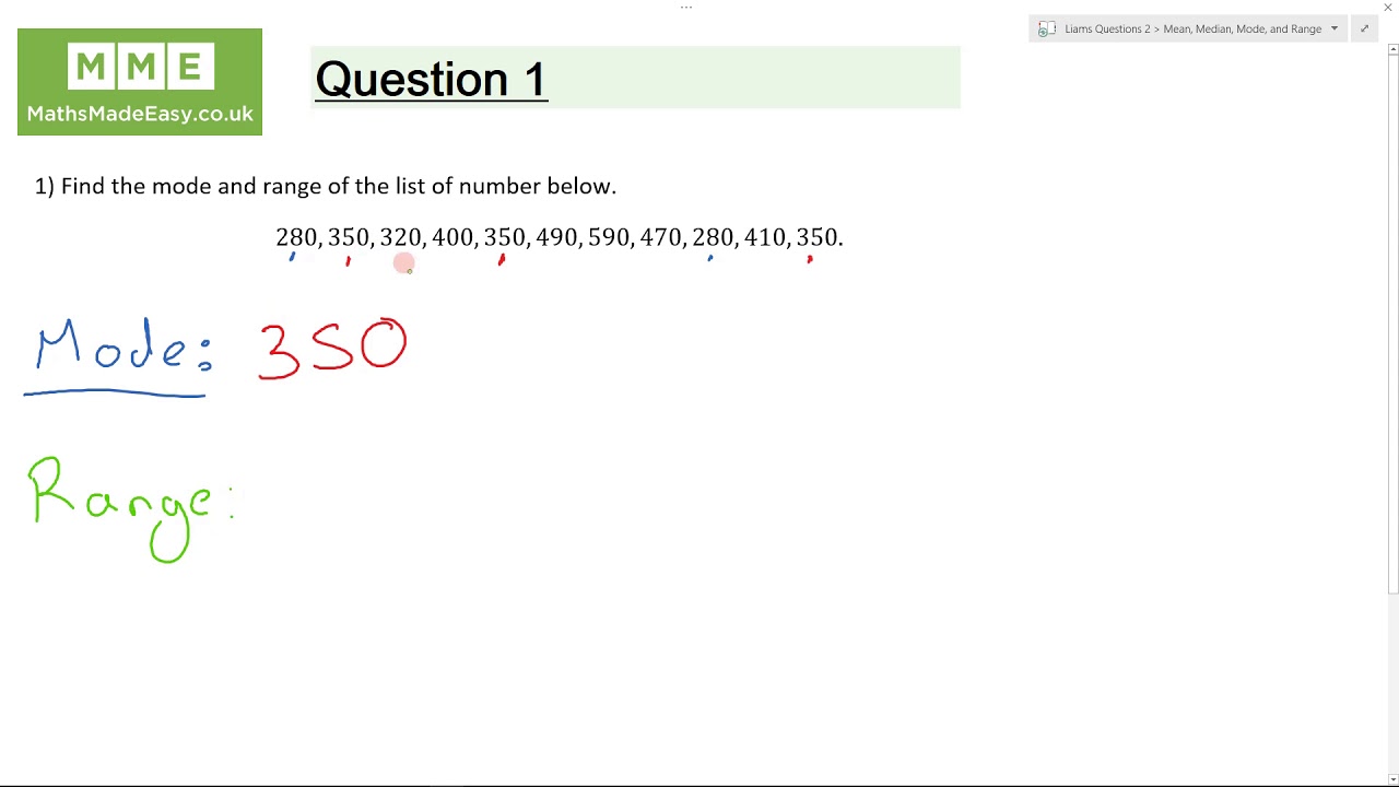 The range is the difference between the lowest and the highest value. The lowest value is 280 and the highest is 590, so: