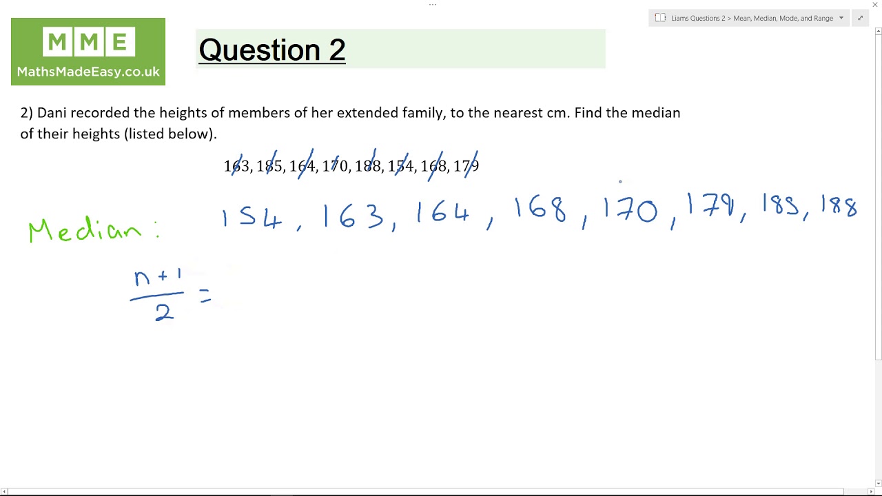 The answer 4.5 tells us that the median is half-way between the 4th value and the 5th value. The 4th value is 168 and the 5th value is 170, so the median is 169.