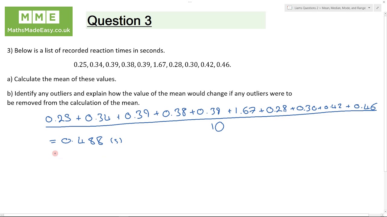 b) Identify any outliers and explain how the value of the mean would change if any outliers were to be removed from the calculation of the mean.