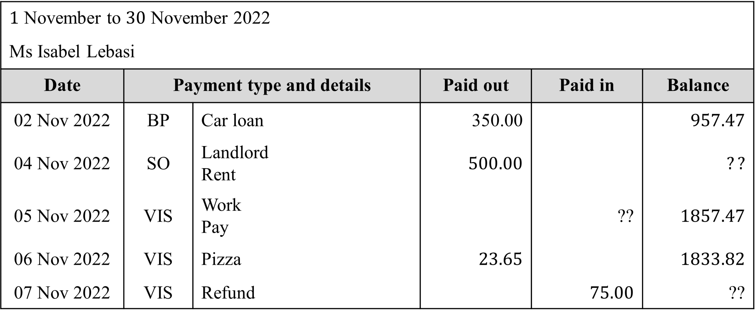 Here is a part of Isabel’s latest bank statement.