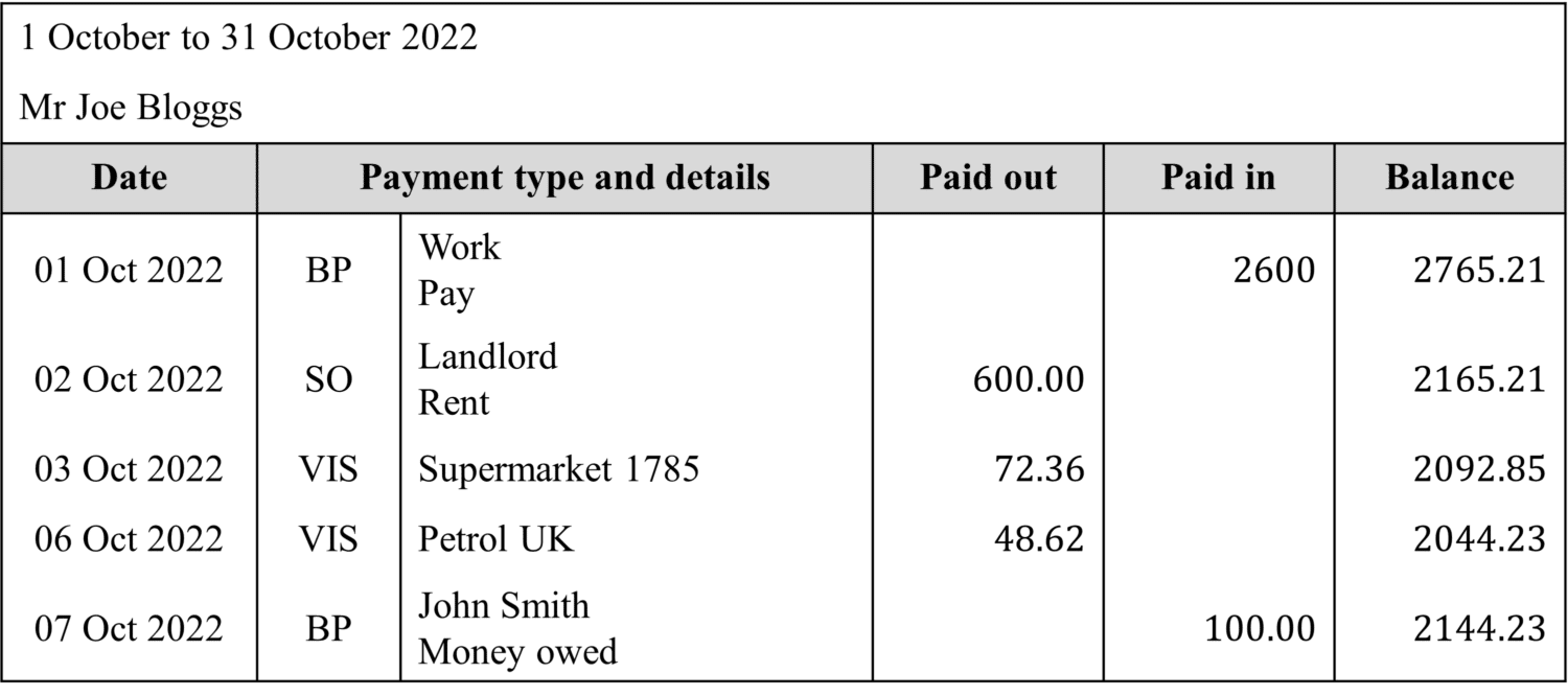 A current account is ordinarily used on a daily basis to pay for bills and make purchases, the ingoing and outgoing money then appears on a monthly statements, showing the method of transaction, the amount of money and where the money is going/from. The statements for current accounts often look similar to the image shown below.