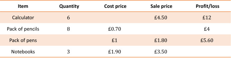 Complete the table and calculate the total profit made on these items.