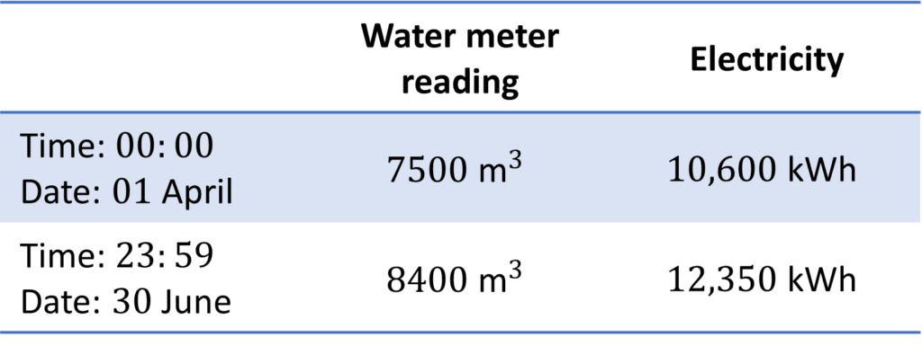 The table on the right shows the water and electricity readings at the start and end of a 3 month period.