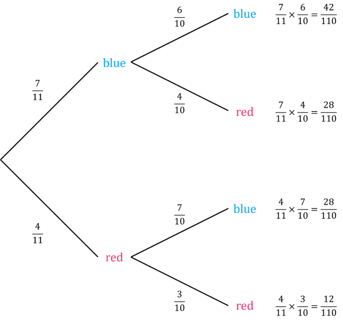 Step 2: Use the tree diagram to determine the probability of selecting the same colour twice. We can see that there are two ways of doing this, either blue and blue, or red and red. We use the AND rule via the probability tree, so