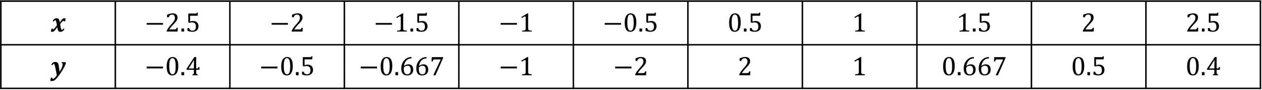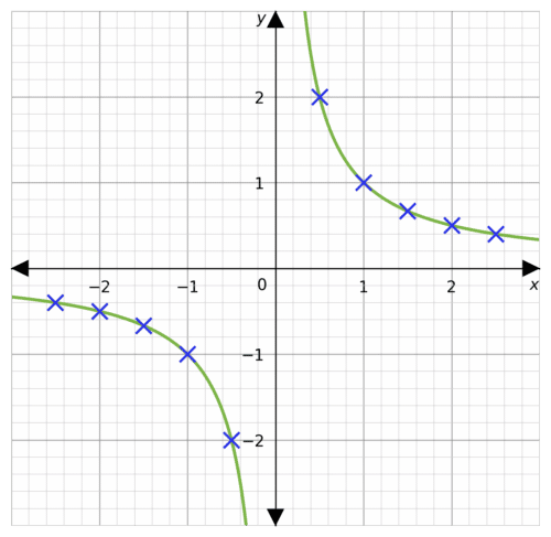 Using the equation y= \dfrac{1}{x} draw a table of coordinates from x = -2.5 to x=2.5. Use the values to plot the graph between these x values.