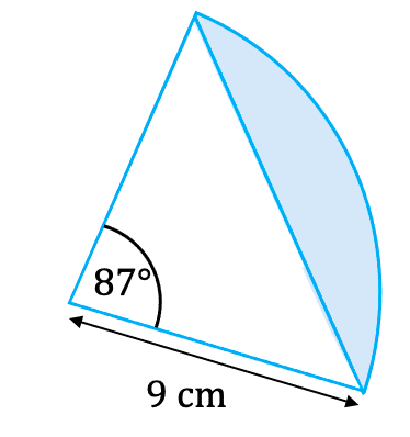 For the question, we have a sector with an angle of 87 \degree and a radius of 9 \text{ cm}. To find the area of the segment highlighted we do the following: