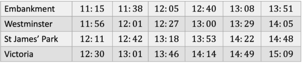 How long would it take to get to Victoria if the 12:05 train was boarded from Embankment?