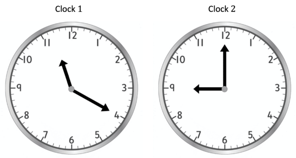 Helena is starting a new job. Each day, her shift will start at the time shown on Clock 1, and finish at the time shown on Clock 2. How long is her shift each day?