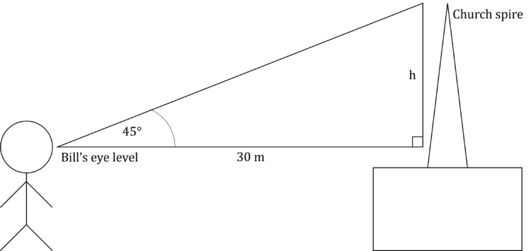 Example: Bill is 30\text{ m} away from a church. The angle of elevation when he looks at the top of the church’s spire is 45\degree. If Bill’s eye level is 1.5\text{ m} above the ground, how tall is the church spire?