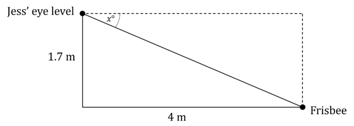 Jess looks downwards at a frisbee that has landed 4\text{ m} away from her feet. If Jess’ eye level is 1.7\text{ m} above the ground, find the angle of depression.