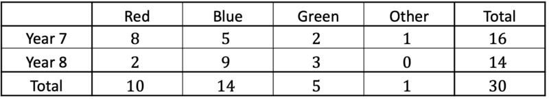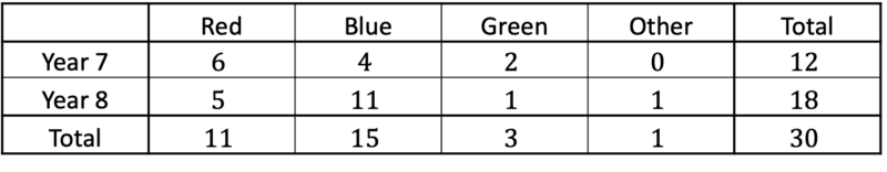 The following table shows the favourite colours of Year 7 and Year 8 students.