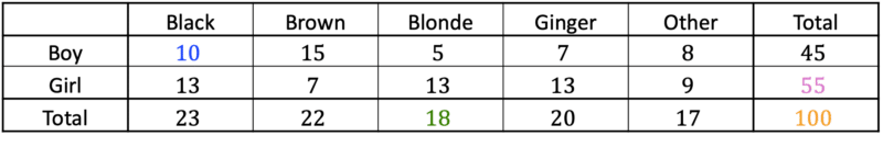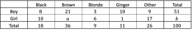 The following two-way table shows information about the hair colour of another 100 children, with some missing values: