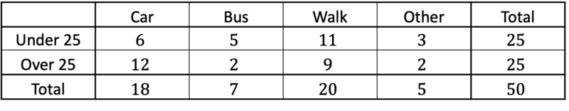 From the table, we can see 11 under 25‘s walk to school or work, out of a possible 50 people.